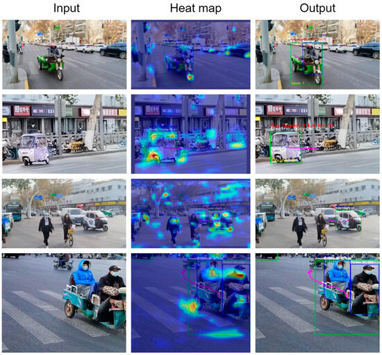 Heatmaps offer an intuitive means of understanding the regions of an image most salient to the model’s decision-making process. By examining the heatmap, one can identify regions in the feature map exhibiting elevated activation values, thus gaining insight into the features to which the model directs its attention. As illustrated in Figure 13, for electric tricycle detection, the area surrounding the front wheel exhibits a high activation value, suggesting this region is a critical feature for accurate object identification.