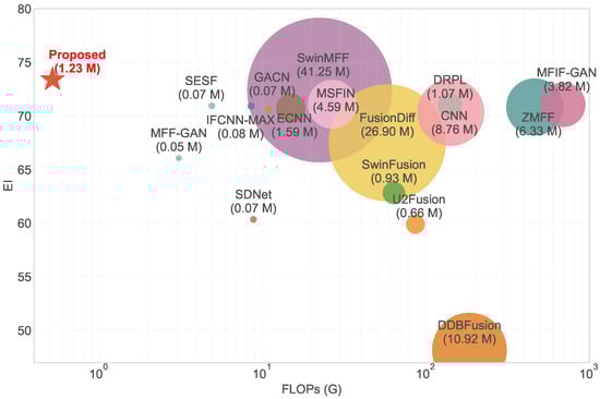 Quantitative comparison of model size (indicated by bubble size), computational complexity (FLOPs), and fusion quality () among different deep learning-based MFF methods on the Lytro dataset [28].
