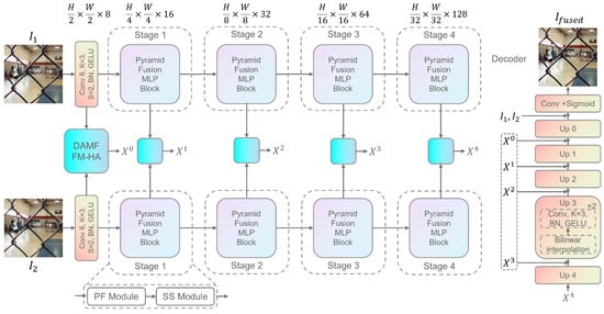 Following each stage, the outputs from both images are fed into the proposed Dual-Path Adaptive Multi-scale Feature-Fusion Module based on Hybrid Attention (DAMFFM-HA) for multi-scale fusion. Finally, the fused image is progressively restored to its original dimensions through four decoders, each comprising bilinear interpolation and convolutional layers.