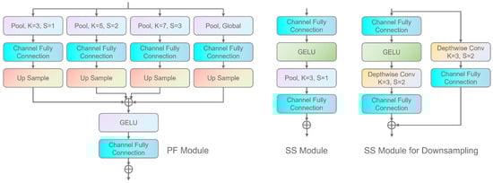 Pyramid Fusion Module (PF Module). The PF module generates a feature pyramid using four branches, each employing a pooling layer with a distinct kernel size. Unlike conventional pooling layers, the PF module utilizes learnable pooling layers to more effectively aggregate local visual cues. Following the acquisition of the feature pyramid, a channel fully connected (FC) layer maps the input C channels to channels. Subsequently, nearest neighbor sampling is applied to obtain multiple feature maps, which are then summed and passed through a GELU activation function. Finally, another channel FC layer transforms the summation result into the final feature representation.