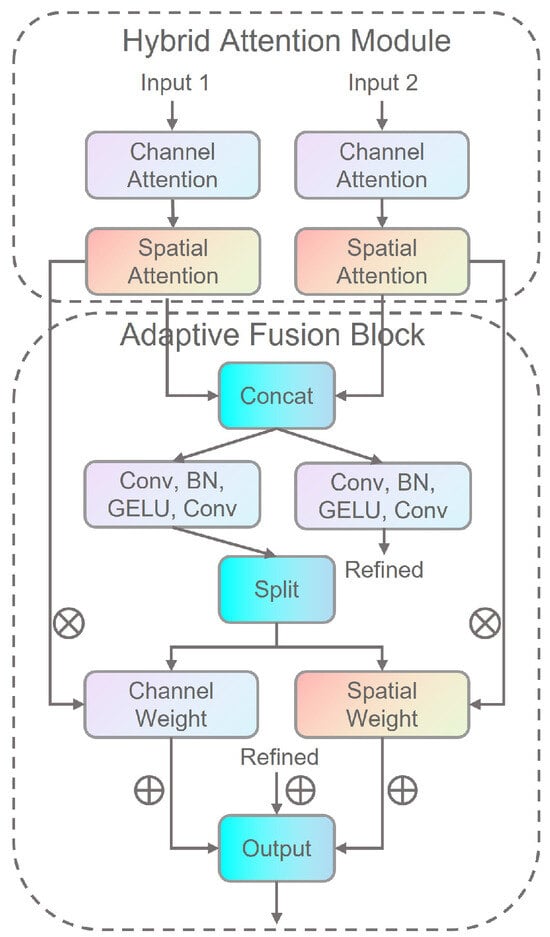 Adaptive Fusion Block. The adaptive fusion block serves as the core component of DAMFFM-HA, responsible for adaptively fusing dual-path features enhanced by attention. The module processes input features and through independent attention modules to obtain enhanced features and , ensuring each feature path is optimized according to its inherent characteristics.