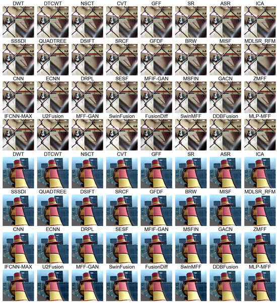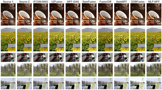 Methods for Comparison. To comprehensively evaluate the performance of our proposed MLP-MFF, we compare it with various state-of-the-art methods from different categories. For traditional methods, we include both spatial domain and transform domain approaches. The spatial domain methods include SSSDI [63], QUADTREE [64], DSIFT [65], SRCF [28], GFDF [66], BRW [67], MISF [68], and MDLSR_RFM [69]. The transform domain methods include DWT [14], DTCWT [70], NSCT [71], CVT [72], GFF [73], SR [74], ASR [75], and ICA [76]. For decision map-based deep learning methods, we compare with CNN [19], ECNN [77], DRPL [78], SESF [31], MFIF-GAN [33], MSFIN [20], GACN [79], and ZMFF [35]. For end-to-end deep learning methods, we compare with IFCNN-MAX [39], U2Fusion [40], MFF-GAN [41], SwinFusion [22], FusionDiff [23], SwinMFF [21], and DDBFusion [42]. These methods represent the current state-of-the-art in MFF, covering different technical approaches and architectural designs. The comparison with these methods allows us to thoroughly evaluate the effectiveness and advantages of our proposed MLP-MFF approach.