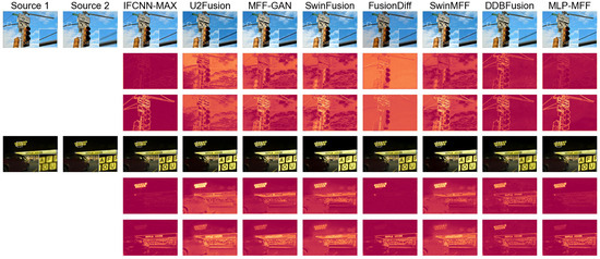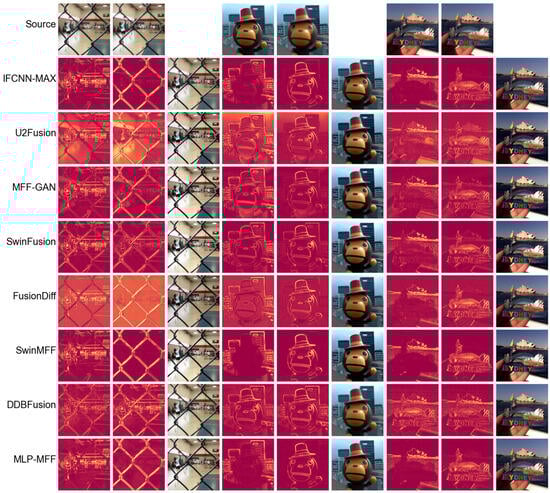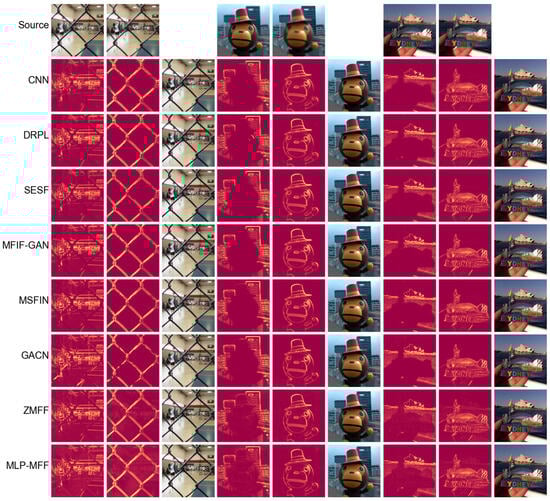 To provide a more intuitive comparison of the performance of different end-to-end methods, we further used the difference maps between the fusion results and the two source images as a basis for comparison. A greater discrepancy between the two difference maps indicates a superior fusion result [21]. First, we compare our method with decision map-based deep learning approaches in Figure 6. Even though our method is an end-to-end fusion approach where fused image pixel values are inferred by the network rather than sampled from source images, its difference maps are comparable to those produced by decision map-based deep learning methods. This demonstrates that our proposed method, similar to SwinMFF [21], achieves excellent pixel-level fidelity. Next, we compare our method with other end-to-end approaches in Figure 7. Our method, along with IFCNN-MAX and SwinMFF, significantly outperforms other methods in this comparison. While IFCNN-MAX and SwinMFF show slightly superior results to our proposed method, their computational costs are approximately 16 and 43 times higher, respectively. Therefore, our method strikes a favorable balance between computational efficiency and fusion quality.
