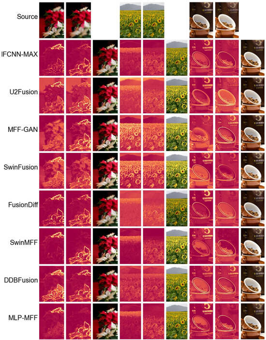 Datasets for Evaluation. MLP-MFF’s performance was rigorously evaluated against three prominent MFF benchmarks: Lytro [28], MFFW [62], and MFI-WHU [41]. The Lytro dataset, consisting of 20 light-field camera image pairs, facilitated both qualitative and quantitative analysis. MFFW, with its 13 image pairs exhibiting pronounced defocus, was employed for qualitative evaluation. Similarly, the MFI-WHU dataset, offering 120 synthetically generated (via Gaussian blur), was also used for qualitative assessment.