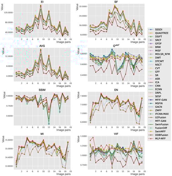 Evaluation metrics. To comprehensively evaluate the performance of different fusion methods, we employ eight widely-used metrics that can be categorized based on their theoretical foundations. Information theory-based metrics include Entropy (EN) and Mutual Information (MI), which measure the information content and transfer in the fused image. Edge and gradient-based metrics consist of Edge Information (EI), Spatial Frequency (SF), Average Gradient (AVG), and , which assess the preservation of edge details and image clarity. Structure and visual quality-based metrics include Structural Similarity Index Measure (SSIM) and Visual Information Fidelity (VIF), which evaluate the structural preservation and visual quality of the fused image. These metrics provide a comprehensive evaluation framework that considers different aspects of fusion quality, including information content, edge preservation, structural similarity, and visual quality.