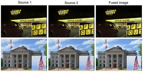 - Liu, Z.; Chai, Y.; Yin, H.; Zhou, J.; Zhu, Z. A novel multi-focus image fusion approach based on image decomposition. Inf. Fusion 2017, 35, 102–116. [Google Scholar] [CrossRef]