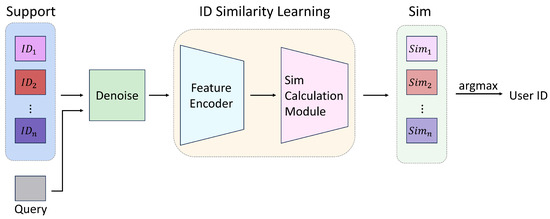 In the user identity verification process, the user’s information is compared with the support data. After undergoing a denoising operation, the similarities are learned through ID similarity learning. The output similarities are then compared to produce the final result of the user ID.