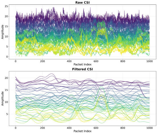 Figure 3 illustrates the effectiveness of our denoising process through a visual comparison of raw and filtered CSI signals, showing substantially smoother trajectories that better represent the underlying patterns of human movement. The filtered signals maintain essential amplitude variations while eliminating rapid oscillations that typically represent noise rather than meaningful data.