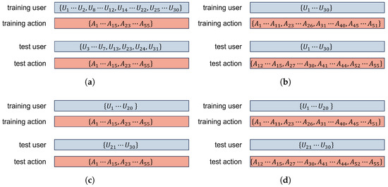 The data splitting settings. (a) Cross-Person-Cross-Scene (CPCS); (b) Cross-Action (CA); (c) Cross-Person (CP); (d) Cross-Action-Cross-Person (CACP).