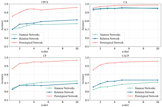 The experimental results are shown in Figure 5 and Table 4. It can be observed that Prototypical Network maintained high accuracy in all four data splitting settings, indicating that it possesses few-shot learning capabilities. However, the performance of Siamese Networks and Relation Networks on CPCS, CP, and CACP remains relatively low, indicating their suboptimal effectiveness for this type of task. Therefore, we conclude that the Prototypical Network is the best choice among the three.