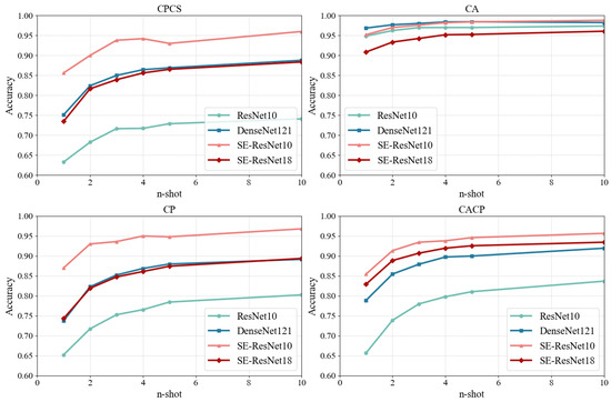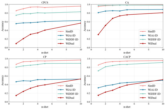 There are various networks that can implement few-shot learning, but their performance varies. To select the best network for our task, we compared three classic few-shot learning networks: Siamese Networks [22], Prototypical Network [20], and Relation Network [23]. We take the same SE-ResNet as the feature encoder of the three networks and evaluate their performance given n samples from each user as the support set, i.e., n-shot test.