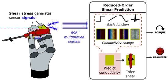 Reduced-order shear predictions using multiplexed impedance measurements. By using our reduced-order models of conductivity to interpret hundreds of incoming sensor signals, changes in torque and diameter can be straightforwardly monitored during robotic twisting tasks.