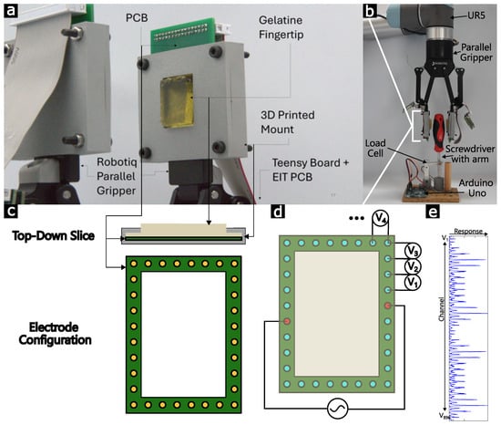 Sensorized fingertips were joined to the inner surfaces of both gripper fingers, as seen in Figure 2. A gelatin-based hydrogel was used as the homogeneous soft sensorized surface, combining gelatin powder (240 bloom, MM ingredients, Wimborne, UK), water, glycerol (Fisher Scientific, Waltham, MA, USA), citric acid monohydrate (Fisher Scientific, Waltham, MA, USA), and salt (Sainsburys, London, UK) at a mass ratio of 1:1.5:1.5:0.2:0.1. The full gel preparation process is described by Hardman et al. in [34], where its stability is demonstrated over multiple months with changing environmental conditions, and in [24], where the material is evaluated for EIT applications. The gel was melted in an oven at 50 °C, cast into 3D-printed molds, and allowed to solidify overnight. Upon removal, the fingertip was simultaneously clamped onto the Robotiq gripper and onto a PCB introducing 32 peripheral electrodes, as shown in Figure 2. A ribbon cable joined each PCB to the boards used for the multiplexed measurements, namely Zhu et al.’s EIT-kit [33]. Throughout this work, the board was configured to measure tetrapolar AC impedance RMS values at 5 kHz using the traditional opposite-adjacent electrode configurations [18], returning 896 information channels in each frame, with a frame rate of 1.85 Hz. These measurements were serially transmitted to a connected PC where they were recorded and analyzed. Due to symmetry, only one of the fingertips is considered.