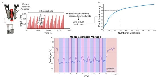 Using Figure 2’s setup, we first collect a dataset of 100 responses when torques are applied to the screwdriver: 10 values, each repeated 10 times. For each, the responses of all 896 channels (Figure 2e) are monitored. The load cell’s ground truth during this data collection is shown in Figure 3. This torque dataset is first used to verify the feasibility of torque prediction from the fingertips, using linear regression (see Section 2). Figure 3 shows the mean voltage of the electrodes during an applied normal force and during a shear force with the same normal force used to determine a baseline value for the voltage before twisting occurs. Using 272 of the 896 channels achieves 80% accuracy (Figure 3), which increases in accuracy as more channels are used. This is a promising result, demonstrating that the fingertip’s signals contain sufficient information about the twist-based shears. However, this linear regression can only make such predictions for one screwdriver diameter: since its generation has not used any prior physical knowledge, new datasets (each lasting approximately 1 h) would have to be generated for each new screwdriver. We instead aim to predict the torque using physical insights into the conductivity deformations, such that our model can be used to monitor changes in both torque and diameter. We begin with the simplifying assumption, based on observations of the main deformation directions, that the conductivity only varies on the axis perpendicular to the axis of the torque (Figure 4a). We therefore focus our attention on modeling the 1D conductivity changes which are induced by a given torque and diameter.
