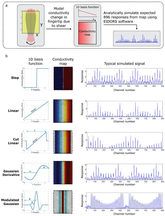 Details of the 5 proposed basis models. Five physically motivated 1D basis functions are introduced to model the shear. (a) The pipeline of generating signals using the proposed model. (b) A table of proposed model, EIDORS-simulated FEM of conductivity for that model and simulated signal calculated from the FEM.