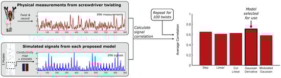 To select the model which best represents the physical effects of our twisting tasks, the simulated signal for each model is compared to Figure 3’s measured signals, and the average cross correlation is calculated in order to rank the models. Using this ranking, the Gaussian Derivative Model is found to be the best selection for approximating the conductivity over the surface (Figure 5), with the highest cross correlation value. Henceforth, the Gaussian Derivative Model is used to generate all simulated signals unless otherwise specified.