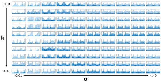 The shape of the Gaussian Derivative Model’s conductivity map is governed by two parameters: k and . Varying these varies not only the shape of the map but also the simulated signals. These signals can be precomputed before any analysis takes place, reducing real-time computation: a 100 × 100 × 896 (k ) signal bank of simulated measurements is generated using the model. The range of values used for both is 0.01–4.4 (4.4 being the maximum y value). For visualization purposes, Figure 6 shows a reduced 10 × 10 × 896 signal bank, where the effect of the varying parameters on the signal shapes is clearly visible.