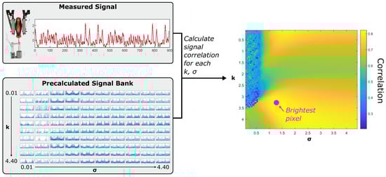 The Derivative of a Gaussian was then used to pre-compute a 100 × 100 dataset of simulated signals, varying two characteristic parameters (k and ) (Figure 6). This matrix can be used to create a heatmap of the cross correlation between each simulated signal and a measured data signal. Locating the global maxima of this heatmap gives the characteristic k and sigma for that measured signal.