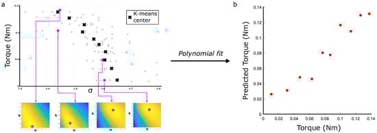 To explore how variations in torque affect this mapping, the dataset shown in Figure 3 is used to generate 99 characteristic heatmaps, from which values of their brightest pixels are plotted in grey in Figure 8a. Four representative heatmaps are shown, with their values marked by the pink dots. Given the variance in the ground truth torque values which were recorded, K-means clustering was used to sort the torques and characteristic parameters into groups: the black crosses mark their centers, with a correlation of between torque and (compared to before clustering occurred). Once a second-order polynomial is fitted to these points (see Section 2), Figure 8 shows the corresponding torque predictions of the clustered data.