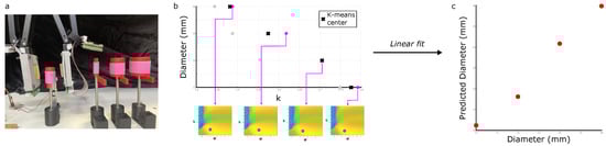 Predicting diameters using the reduced-order model. (a) Data was collected from four screwdriver diameters. (b) The k value of the heatmaps’ brightest pixels for the diameter measurements, and the clustered central value for each diameter. Note that some dots lie on top of each other. (c) Predicting values of diameter once a first-order polynomial is fitted to this data.