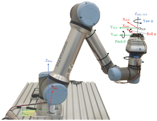 The UR5e controller provides robot data such as the pose of the tool center point (TCP) frame via the TCP/IP-based (Here, TCP/IP refers to the Transmission Control Protocol/Internet Protocol, not to the tool center point) Real-Time Data Exchange (RTDE) interface with a configurable rate up to 500 Hz [21]. In this work, a rate of 100 Hz is used. For working with RTDE interface, the RTDE Python Client Library v2.7.2 is used.The TCP pose vector contains the coordinates and orientation of the TCP frame in the base frame (used as a reference frame) of the UR5e robot. Orientation of the TCP frame is provided in the rotation vector form (term used by Universal Robots for axis–angle representation), which is then transformed to quaternion and Euler angles representations.
