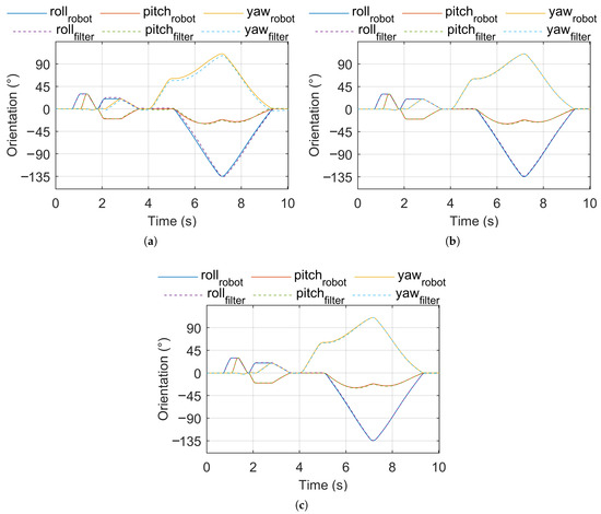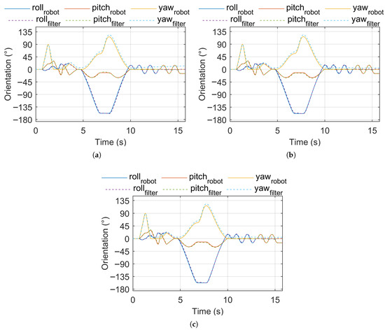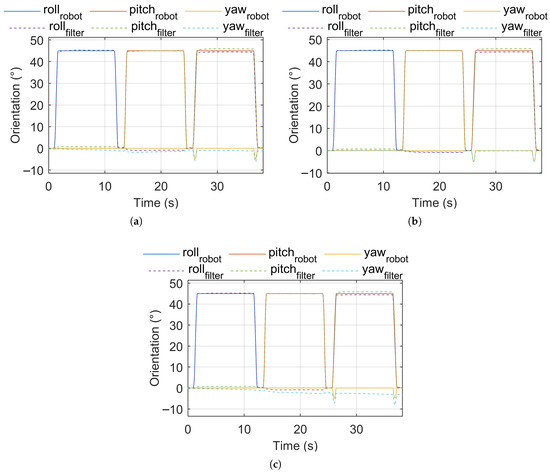 Accurate computation of these metrics relies on a reliable reference for orientation. While indirect reference systems, such as optical tracking [10] or high-grade integrated inertial systems, can be used to provide such data, they may still lack the precision, repeatability, or long-term stability required to fully evaluate filter performance. In contrast, a high-precision robotic arm not only traces the pose with high accuracy but can also execute predefined trajectories reliably, enabling consistent and repeatable evaluation of orientation estimation algorithms. Several studies have used industrial robotic manipulators as precise, repeatable references for evaluating orientation or full pose estimation. Representative examples include Cavallo et al., who mounted an IMU on a KUKA manipulator to compare EKF-, Mahony-, and Madgwick-type estimators against the robot’s orientation [11]; El-Gohary and McNames, who validated joint-angle estimation with an IMU against a high-precision robot arm [12]; Ricci et al., who systematically characterized static and dynamic orientation accuracy using a KUKA LWR 4+ executing sinusoidal trajectories across frequencies [13]; Hislop et al. used an ABB IRB2600 industrial robot to validate the dynamic orientation accuracy of a commercial IMU system across several angular velocities and orientations, reporting error statistics under controlled motion conditions [14]; and more recently Kuti et al., who proposed a UR-series robot-based procedure that treats the manipulator as a high-accuracy reference for orientation sensors [15]. In line with this established practice, a robot arm is used as reference in this work. However, in contrast to most prior work that primarily reports time-domain metrics, our study adds an explicit frequency-domain evaluation, an analysis that remains relatively uncommon in the literature.