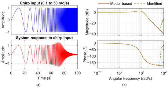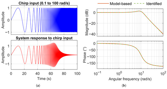 For this example, and are selected. The system is evaluated over the frequency range from 0.1 to 100 rad/s. A sine chirp signal with logarithmic frequency progression in the same range (0.1 to 100 rad/s) is applied as input (Figure 7a), and the known frequency response (model-based) is compared with the composite frequency response identified from the input and output signals using the Ockier method. As shown in Figure 7b, the two responses are nearly identical.