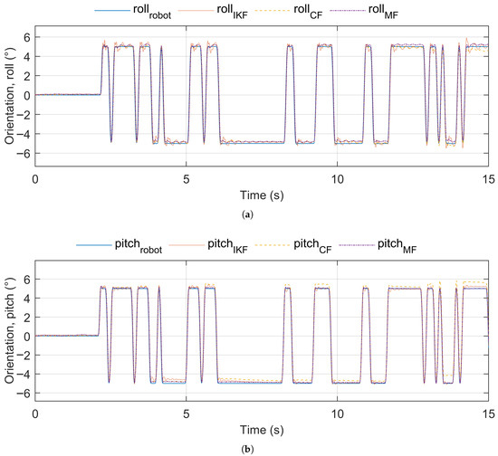 The RMSE and MaxAE values for roll and pitch angles and the sum of the errors for the angles, corresponding to the used filter and test signal, are presented in Table 2. The lowest value for a given test signal and metric is marked in green, and the biggest is in red. Errors for yaw angle are not taken into account due to the uncompensated yaw drift. Yaw drift happens due to the gyroscope drift and the inability of the gravity components analysis method to estimate the yaw angle and thus compensate for the drift. For the same reason, the cost function for tuning filters only included RMSEs for roll and pitch.
