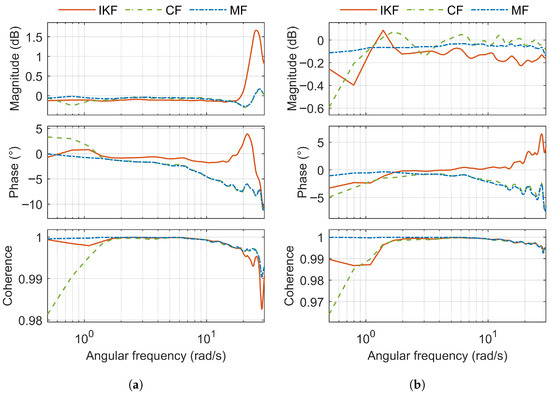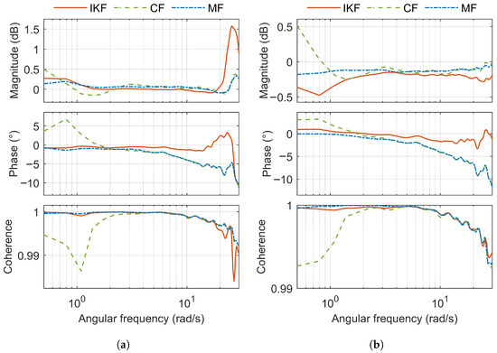 To comprehensively evaluate the filters’ performance, traditional time-domain error metrics are combined with frequency-domain analysis, which captures key dynamic properties such as phase shift, magnitude response, and input–output coherence. While time-domain metrics like orientation error are effective for assessing accuracy during slow or static conditions, they may obscure important characteristics under dynamic motion, e.g., small time delays can result in large instantaneous errors despite accurate tracking. Frequency-domain analysis addresses these limitations by revealing how each filter attenuates or distorts signals across different frequency bands, quantifies phase delays, and measures linear correlation via coherence. These properties are robustly computed using the composite frequency response and coherence estimation approach described in the Ockier method [9].