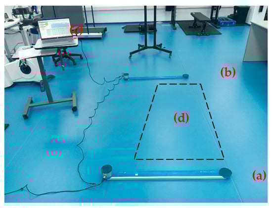 Opto-Jump device setup. The image shows the LED barriers, emitter (a), and receiver (b), separated by a distance of 3 m and connected to a laptop (c). Jump test execution area (d).