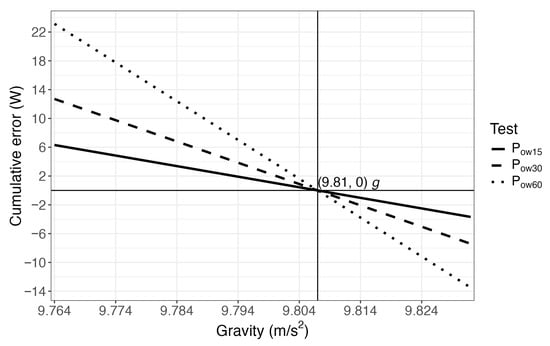 Figure 2 shows the accumulated error in the calculation of the power for each test (Pow15, Pow30, and Pow60) when using the local gravity value versus standard gravity value (g = 9.81 m·s−2).