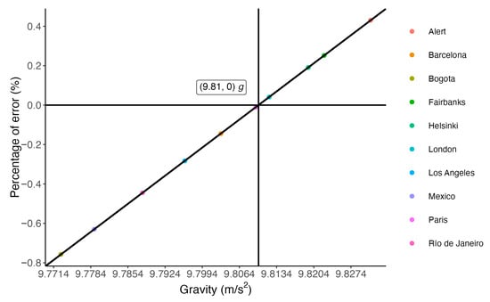Figure 3 shows the percentage error (%) with respect to the standard value of gravitational acceleration, g = 9.81 m·s−2 for the following locations: Alert (Canada), Barcelona (Spain), Bogotá (Colombia), Fairbanks (USA), Helsinki (Finland), London (UK), Los Angeles (USA), Mexico City (Mexico), Paris (France), and Rio de Janeiro (Brazil). The more the value of local gravity deviates from the standard value, the greater the error it causes. The percentage of error is defined according to Formula (8).