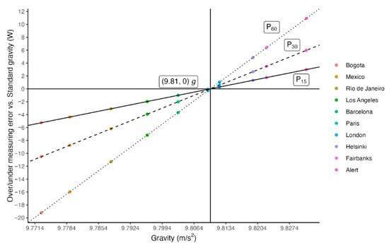 In our study, the results demonstrate notable differences in the calculated power when using the standard gravitational acceleration value (g = 9.81 m·s−2) compared to the location-specific gravitational values derived from the GRS80 model. Specifically, when comparing data computed for the city of Cádiz (Spain) with other locations, significant variations were observed: from −4.55 W to 5.09 W in the Pow15 test, from −8.14 W to 10.70 W in Pow30, and from −14.65 W to 17.9 W in Pow60 (Table 2).