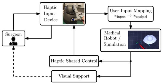 This section introduces the technical system used for the development and validation of our virtual-fixture-based shared control concept; see Figure 2 with the structure of the teleoperation surgery system. Furthermore, the requirements of the shared control system are discussed.