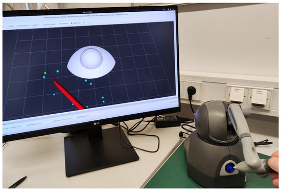 Figure 7 provides a visual illustration of the simulator configuration previously shown schematically in Figure 2. To streamline validation and concentrate solely on functional aspects, the simulation incorporates only the visual models of the eye and scalpel, thereby limiting external interference. It should be emphasized that achieving an accurate biomechanical simulation of corneal tissue interactions was not the objective, as the dynamics of soft tissue interactions were beyond this study’s scope.