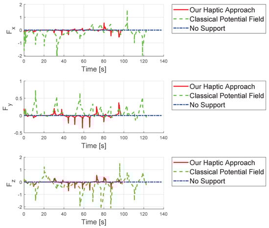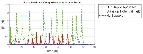 Analyzing maximum forces as shown in Figure 8, the classical potential-field method exerts significantly larger forces, reaching up to app. N, compared to N with our approach, largely due to the relatively large initial distance. Figure 9 presents detailed forces along individual axes. In summary, the proposed concept leads to improved results compared to existing methods from standard techniques.