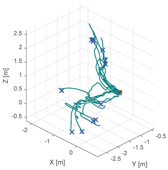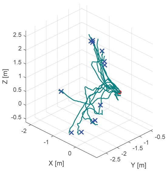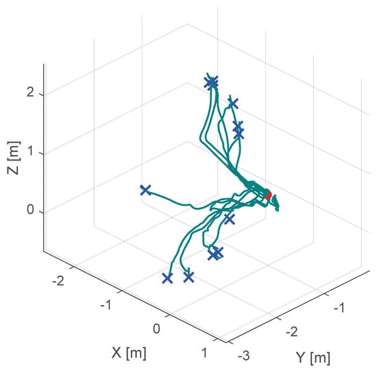 Course of the trajectory of the concept without haptic support. The goal point is the red dot, the blue crosses are the various starting points and the green lines are the resulting trajectories.