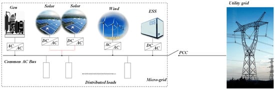 Microgrids are localized low-voltage power supply systems that coexist with the conventional power grid. Their design focuses on generating electricity at the point of consumption, aiming to minimize transmission losses and maximize the efficiency of the generated power. Power electronic inverters facilitate the smooth integration and dependable functioning of distributed energy resources (DERs), thereby presenting substantial prospects for extensive implementation [1,2,3]. Three-level inverters, a type of multilevel inverter, possess advantages such as reduced Total Harmonic Distortion (THD) over traditional two-level inverters, thus finding suitability in a wide range of industrial applications [4]. Figure 1 shows the microgrid architecture, where traditional generators, PV arrays, and battery systems are all connected to a shared AC bus. When the point of common coupling (PCC) is closed, the microgrid remains linked to the main grid; opening the PCC isolates the network, placing it in an islanded operation. Compared to a single distributed generation (DG) unit, microgrids offer greater capacity and enhanced control flexibility, allowing them to meet stringent power-quality requirements [5,6].