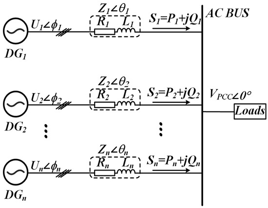 A simplified circuit of an islanded microgrid consisting of n DGs is shown in Figure 3. The complex power output Sn of a single DG unit can be expressed as:
