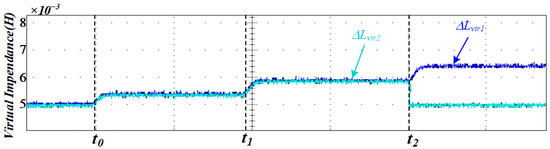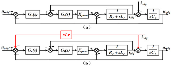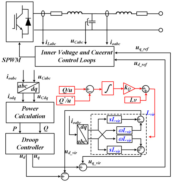 To ensure that the total output impedance remains predominantly inductive, a virtual inductance Lv is introduced into the control block diagram and tuned around its nominal value, as shown in Figure 6b. The product of the inverter output current and virtual inductance is used as a negative feedback signal applied to the voltage reference. According to Thévenin’s theorem, Equation (19) can be rewritten as