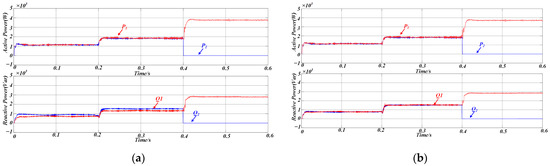 Figure 11b summarizes the simulation results for the proposed control strategy when both DG units are rated at the same power level, and the test sequence replicates the events depicted in Figure 11a. This figure clearly shows that active and reactive power outputs are in a 1:1 ratio when the DG units have the same rated power, and that the output power maintains excellent consistency even when the load changes abruptly or the parallel inverter structure is altered. Corresponding error metrics for the conventional approach and the AVIDC scheme are listed in Table 2.