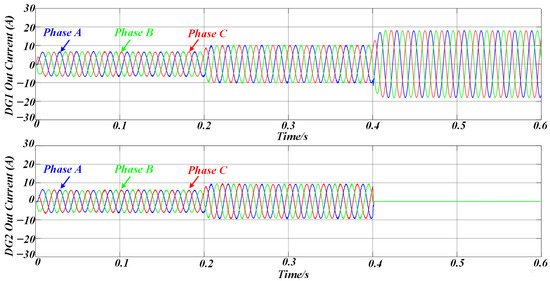 Figure 12 illustrates the variation in the proposed adaptive virtual impedance at different stages to accommodate line impedance mismatches. Figure 13 shows the three-phase output current waveforms of the two DG units, which maintain excellent consistency in terms of amplitude and phase under the same rated power conditions, ensuring that they have the same active and reactive power output. The proposed strategy enables a rapid response to sudden load changes and variations in DG unit availability, ensuring that the output currents of both DG units remain aligned. This effectively suppresses circulating currents between the units.