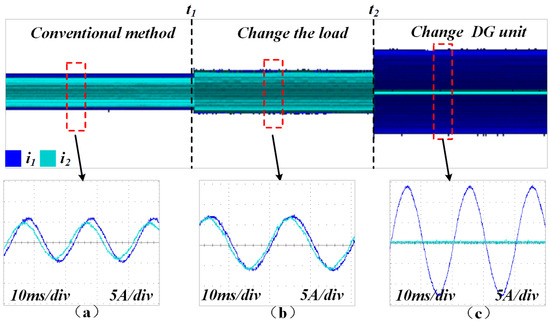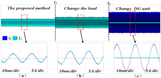 Figure 16 shows that by employing the proposed control method, the two DG units maintain strong consistency in both current amplitude and phase. Additionally, the method demonstrates excellent performance in response to sudden load changes at time t1 and structural changes in the microgrid at time t2.