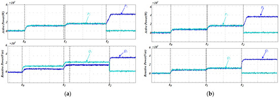 The active and reactive power outputs of each inverter under the conventional droop control strategy are shown in Figure 17a. It can be seen that while the active power of the parallel inverters is equally shared, disparities in line impedance among the inverters lead to deviations in reactive power distribution, preventing equal sharing of reactive power. Figure 17b illustrates the power-sharing performance of the two inverters after the proposed method is applied. The reactive power remains equally shared at t0 when both inverters supply the same load, at t1 when the load undergoes a sudden change, and at t2 when DG2 is disconnected, demonstrating the effectiveness of the proposed method.