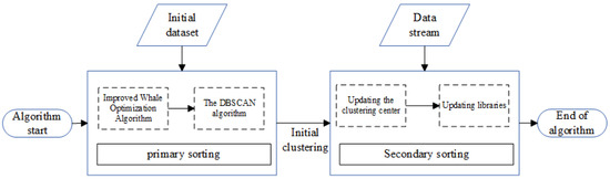 In the face of multiple signal sources, transmitting generates an aliased data stream. The IGWOA-DBSCAN clustering algorithm is first used to perform first-level binning of the initial data and to calculate the clustering centers. During the first-level sorting, the IGWOA optimization algorithm is used to estimate the DBSCAN parameters, since the DBSCAN algorithm relies on human experience for parameter setting. After completion of the first-level sorting, to enter the second-level sorting stage, each pulse of the input is compared with each clustering center, and online sorting is performed by the distance from each clustering center. The algorithm is framed in Figure 1.