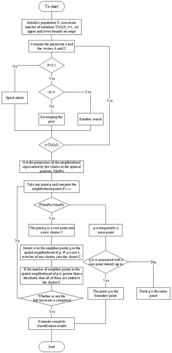 The improved DBSCAN clustering algorithm introduces a new parameter , compared to the traditional DBSCAN algorithm, and therefore relies more on manual experience for parameter setting, and the uncertainty of the sorting results increases. In this section, the improved whale optimization algorithm [17,18,19] is used to obtain the parameter settings of the DBSCAN algorithm to avoid the intervention of manual experience.