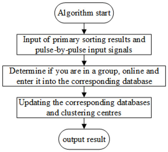 In this section, we will introduce how to perform online sorting of the signals, which belongs to the second-level sorting algorithm in the whole sorting algorithm. Before the second-level sorting, we need to sort the initial data set through the first-level sorting composed of Section 2.1 and Section 2.2, to obtain the number of sorting clusters and the clustering center of each sorting cluster, which provides support for the second-level sorting in this section, and helps to judge which sorting cluster in which library the input signal should be sorted into. The flow clustering algorithm is divided into two steps. Step 1 is to preprocess the initial dataset using the IGWOA-DBSCAN clustering algorithm and calculate the corresponding clustering centers for each cluster obtained. The clustering center is obtained by summing the pulses in each of the sorting clusters obtained during pre-sorting, respectively, and dividing by the number of pulses in that sorting cluster to obtain the clustering center of that sorting cluster. Step 2 performs pulse-by-pulse online binning matching on the pulsed radar signals. If the pulse signal cannot be matched with the clusters in the valid and inactivated pools, it is treated as an anomalous outlier. When the number of anomalous outliers exceeds a certain threshold, it is necessary to re-call the static clustering and update the summary library. In this paper, we introduce the concepts of “cluster validity”, “cluster inactivation,” and “cluster resurrection”. The entire cluster sorting process categorizes clusters into three evolutionary forms: effective, inactivated, and revived [28]. The clusters have an effective library , an inactive library , and an outlier library .