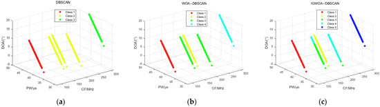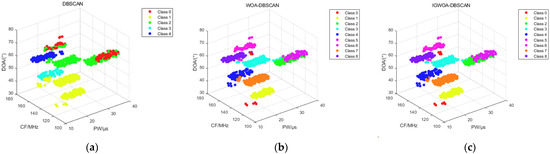 Sorting results of 3% interference pulses for 8 radars in dataset 2. (a) DBSCAN algorithm sorting results; (b) WOA-DBSCAN algorithm sorting results; (c) IGWOA-DBSCAN algorithm sorting results.