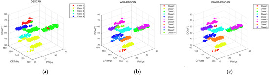 The 3%, 5%, and 10% interference pulses are added to dataset 2 and simulated using the DBSCAN, WOA-DBSCAN, and IGWOA-DBSCAN algorithms, respectively. The 3%, 5%, and 10% interference pulses are generated at the lower bound of each radar parameter, as given in Table 2, with a corresponding number of interference pulses obeying a uniform random distribution at the lower bound of the parameter. When sorting dataset 2 under different interference pulses, the WOA and IGWOA optimization algorithms are used to find the optimal parameters for the DBSCAN algorithm proposed in Section 2.2. Both optimization algorithms were set to 100 iterations with a population size of 20. Under 3% interference pulse, the parameters obtained using the WOA optimization algorithm were (7.6745, 20, 5), while those obtained using the IGWOA optimization algorithm were (7.2959, 28, 5). The standard DBSCAN parameters were set to (10, 80). Under 5% interference pulse, the parameters obtained using the WOA optimization algorithm were (7.6911, 24, 5), while those obtained using the IGWOA optimization algorithm were (7.5508, 34, 5). The standard DBSCAN parameters were set to (10, 80). Under 10% interference pulses, the parameters obtained using the WOA optimization algorithm are (7.2033, 28, 4), while those obtained using the IGWOA optimization algorithm are (8.0251, 30, 3). The standard DBSCAN parameters are set to (10, 80). The parameters obtained by WOA and IGWOA were respectively input into the DBSCAN algorithm proposed in Section 2.2, and the standard DBSCAN parameters were input into the standard DBSCAN algorithm, yielding Figure 9, Figure 10 and Figure 11, respectively.