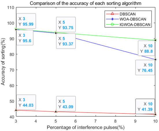Figure 9, Figure 10 and Figure 11 show the sorting results of the DBSCAN, WOA-DBSCAN, and IGWOA-DBSCAN algorithms when 3%, 5%, and 10% interfering pulses are added to dataset 2, respectively. The sorting accuracy of the DBSCAN, WOA-DBSCAN, and IGWOA-DBSCAN sorting algorithms with 3%, 5%, and 10% disturbing pulses, respectively, added to dataset 2, is counted and simulated, and the simulation results are shown below.
